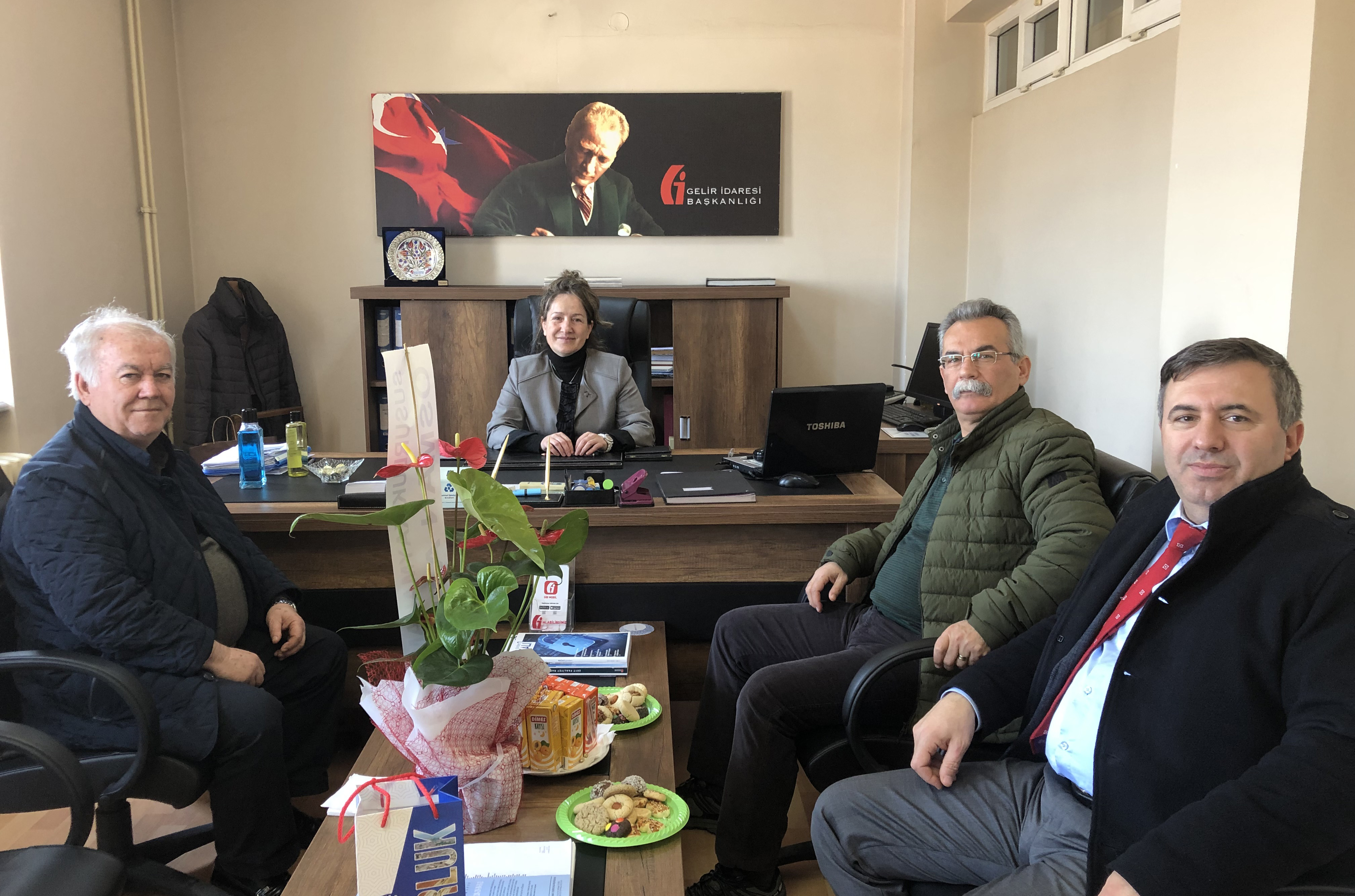 Meclis Başkanımız Sayın Mehmet ÇETİN, Yönetim Kurulu Üyemiz Ahmet CENKER ve Genel Sekreterimiz Yücel SARI, Vergi Haftası kutlamaları sebebi ile Vergi Dairesi Müdür Vekili Sayın Günseri KANTAŞ’ı makamında ziyaret ederek, başta Günseri Hanım olmak üzere Vergi Dairesi Personelimizin Vergi Haftasını kutladılar.