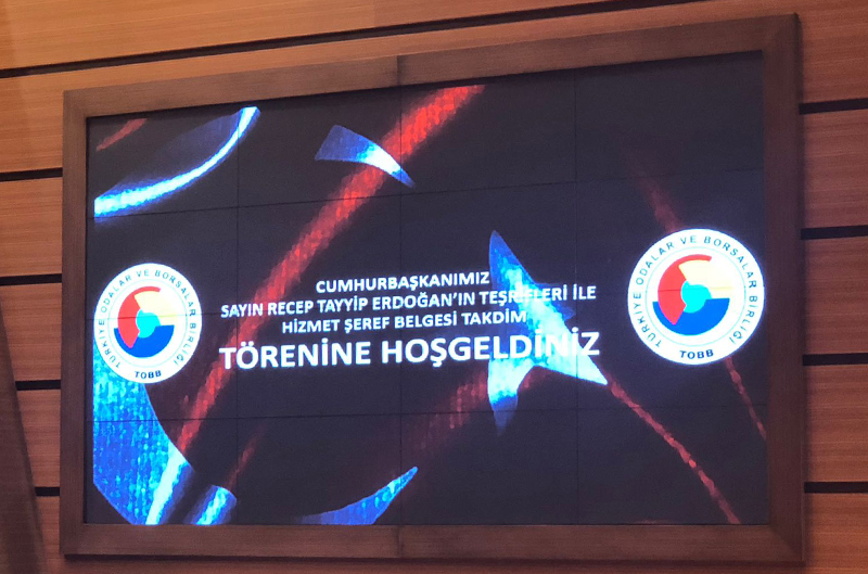 Cumhurbaşkanımız Sayın Recep Tayyip ERDOĞAN'ın teşrifleriyle, Türkiye Odalar ve Borsalar Birliği Başkanı Sayın M. Rifat HİSARCIKLIOĞLU nezdinde TOBB'de gerçekleşen, TOBB'de görev yapan delegelerimizin ödül aldığı "TOBB Hizmet Şeref ve Plaket Töreni" ne Yönetim Kurulu Başkanımız İlker KURT, Meclis Başkanımız Mehmet ÇETİN ve Genel Sekreterimiz Yücel SARI katıldılar.